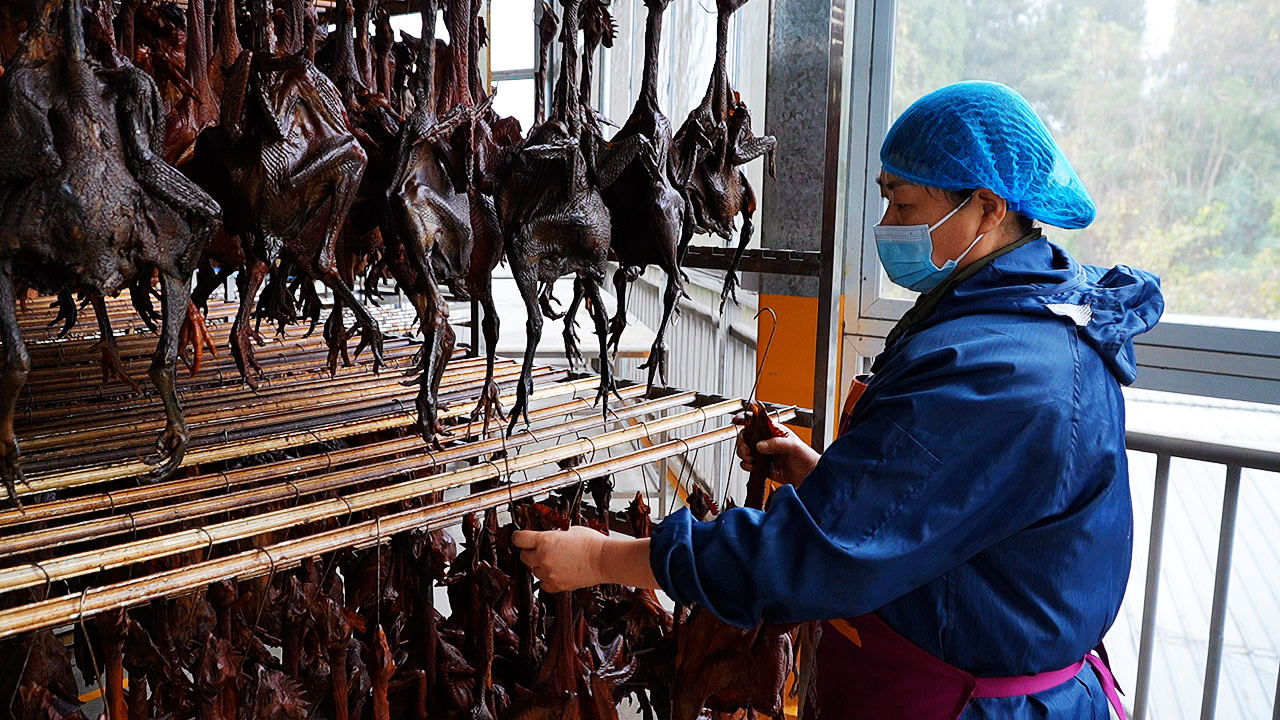 ▲位于铜梁少云镇向阳村的重庆香即福农产品加工有限公司生产车间,工人正用专用的挂钩晾晒腊制品。通讯员 李拉拉 摄
