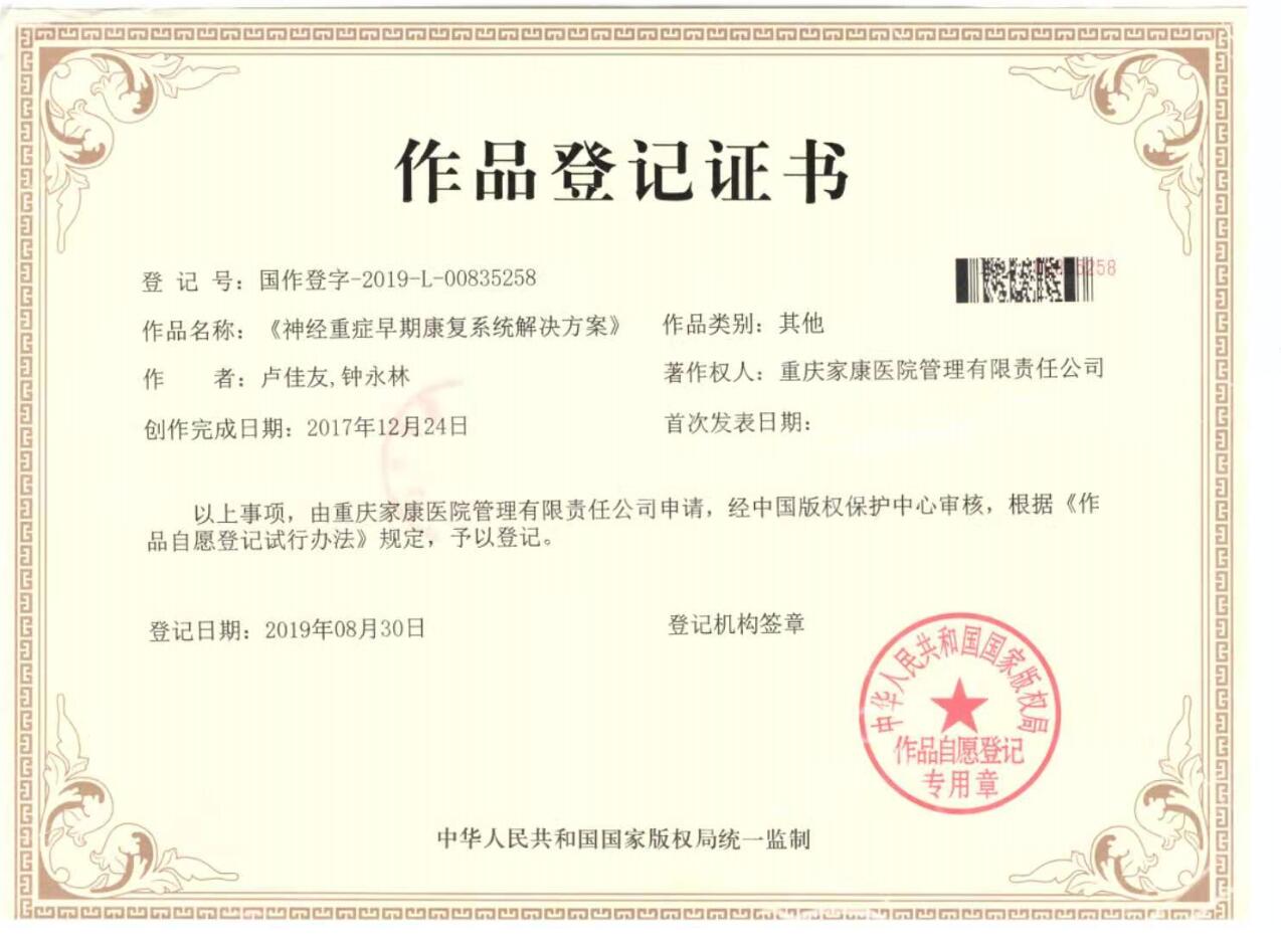 2018年,重庆家康医院在沙坪坝建立。受命于从零开始,招兵买马、引进专家、组织培训,搞科研、接诊、教学、做公益……重复又忙碌的生活中,卢佳友还是跟在部队里一样,见第一就争,有红旗就扛。他主编了《神经重症早期康复整体解决方案》一书,和团队创建神经重症整体康复“五驾马车”概念,致力于结合健康教育、康复养老、智慧远程康复,形成完整康复产业链,造福更多的卒中患者。